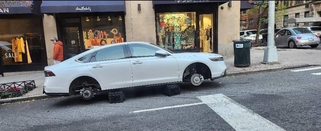 OPPORTUNISTIC THIEVES JACKED a driver’s rims. The targeted white car was relieved of its wheels while parked on 88th Street and Madison Avenue back on Dec. 5.