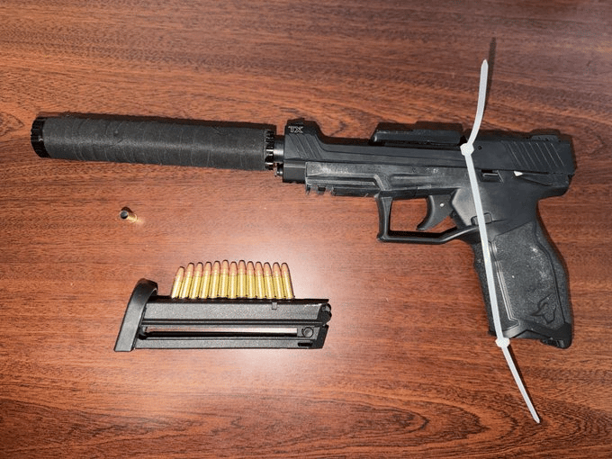 The officers found an amount of meth, knuckle dusters, and a 9mm with a sound suppressor [silencer].