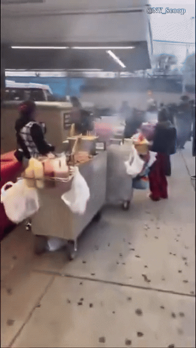 Two women can be seen trading blows as a man in a skullcap tips over her food cart. Ponytails were pulled, and all hell was about to break loose until a cops can be seen stepping in to restore some order.