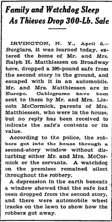 ▀ Cat Burglars Wake Nabe Dropping 300-LB Safe Two Stories (Irvington, NY)