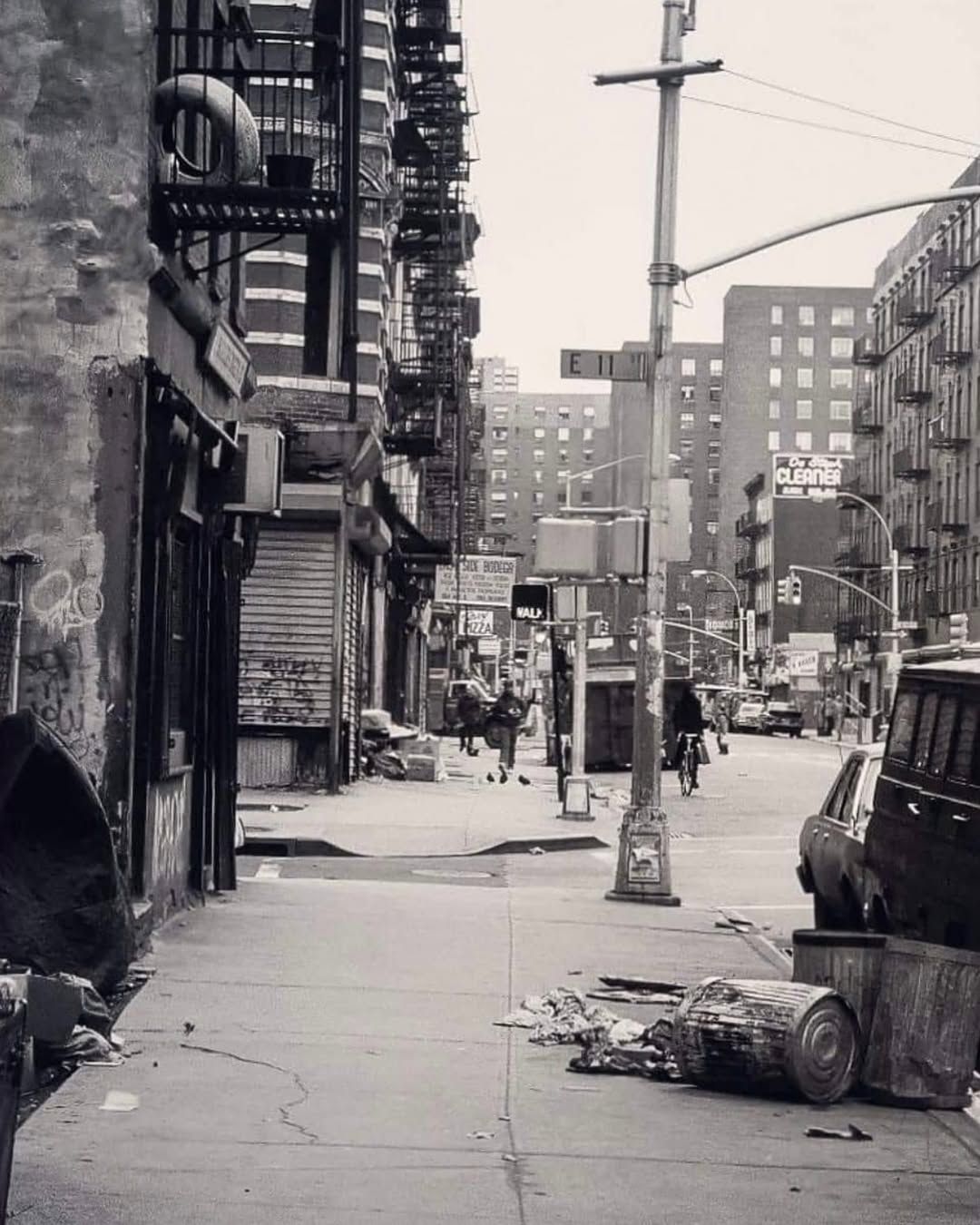Tipped-over garbage pail with its refuse strewn out along the fractured sidewalk like a disemboweled animal in the urban wild. Tagged facades pop like modern hieroglyphics.