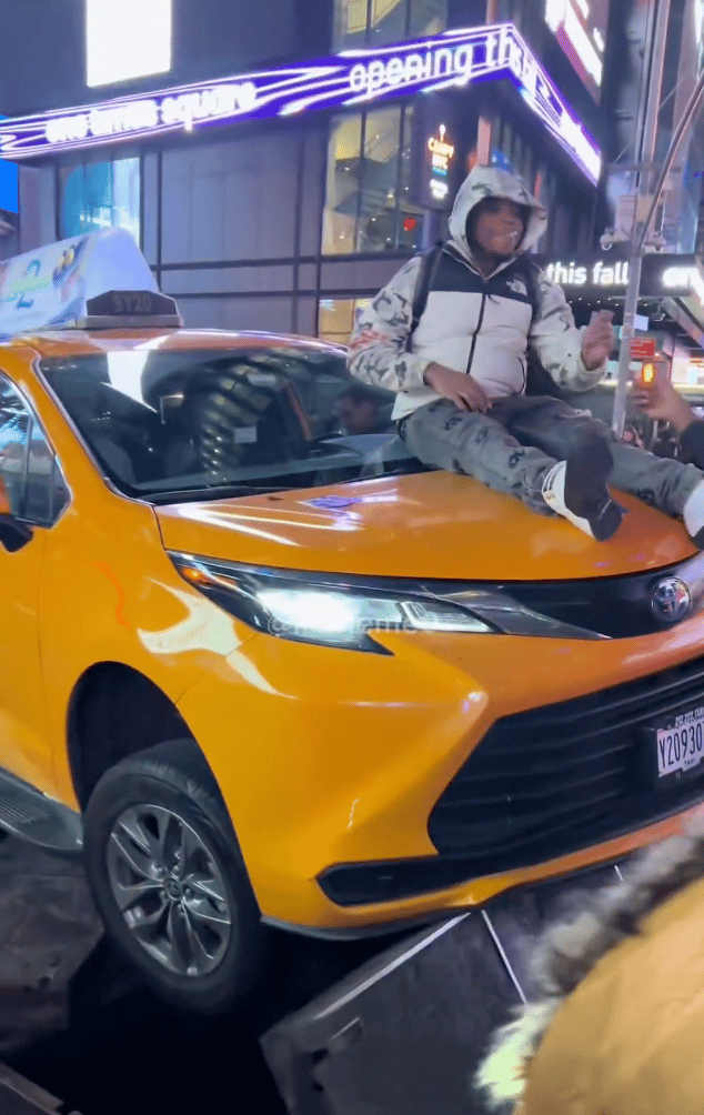 IN THE PIT of one hack’s despair inspired another to capitalize on it. The attention-seeking chum hopped onto a cab that had gotten snagged by a gaping cavity in the street — in Times Square — and proceeds to light a smoke.