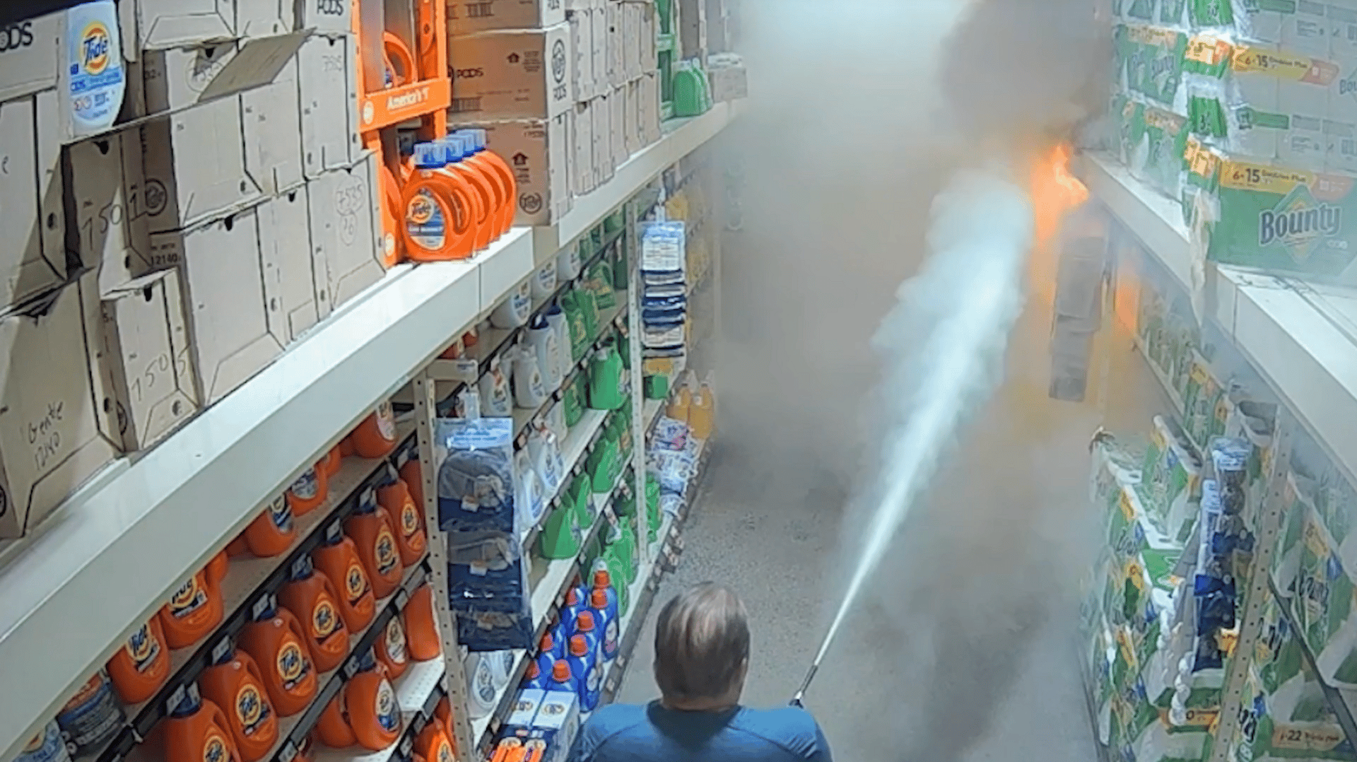 CCTV footage shows flames dancing along the aisle and charbroiling toilet paper rolls and paper towels.